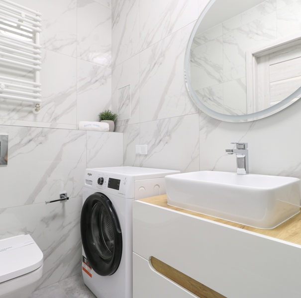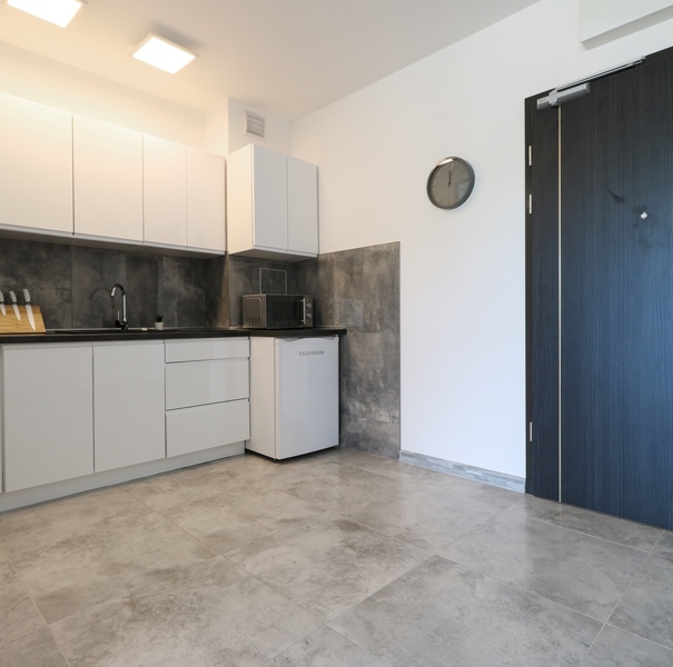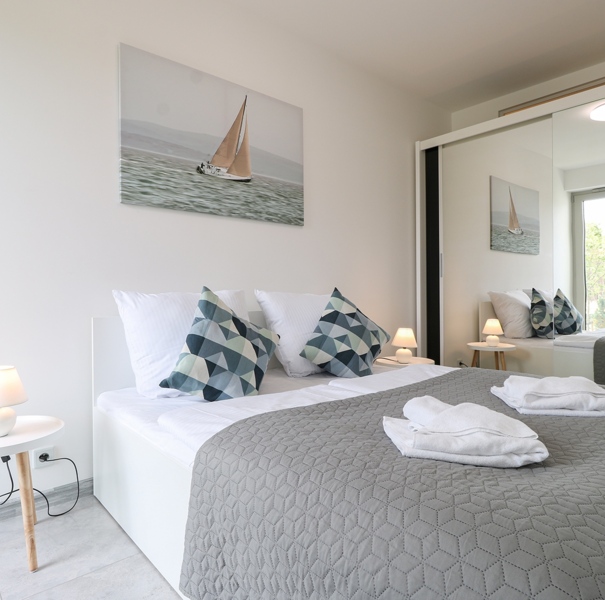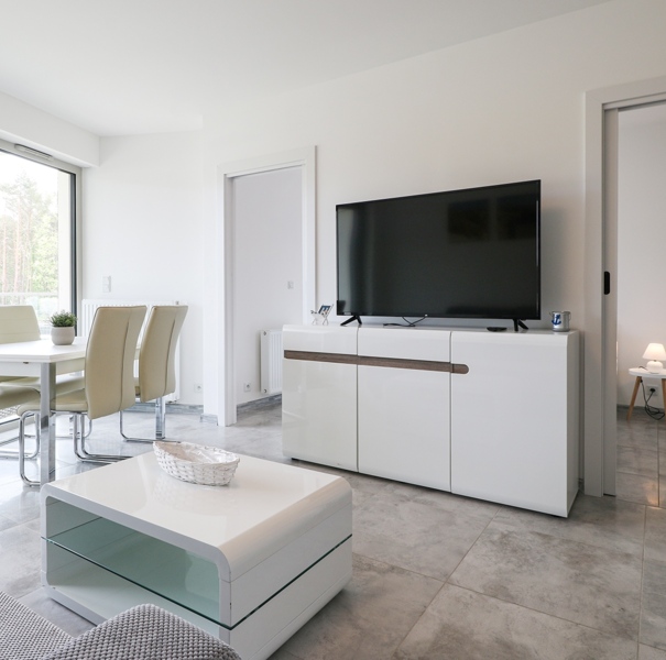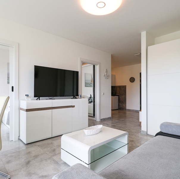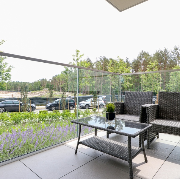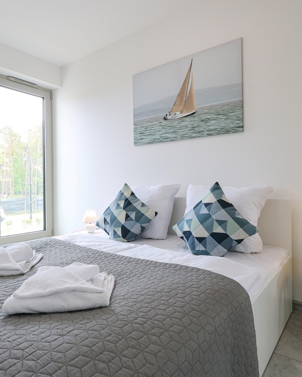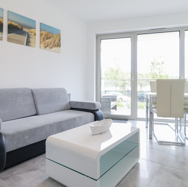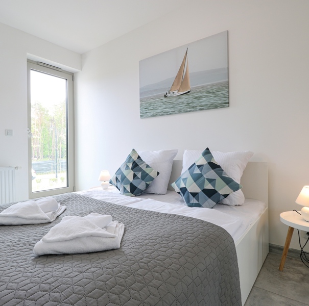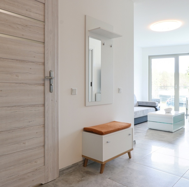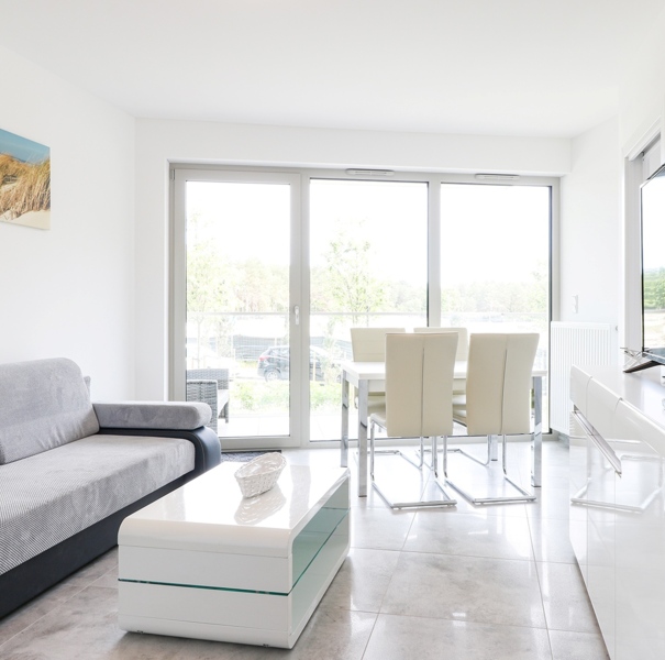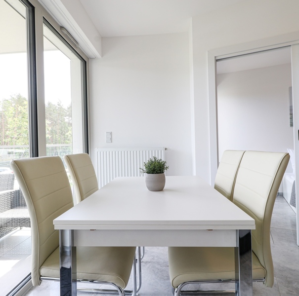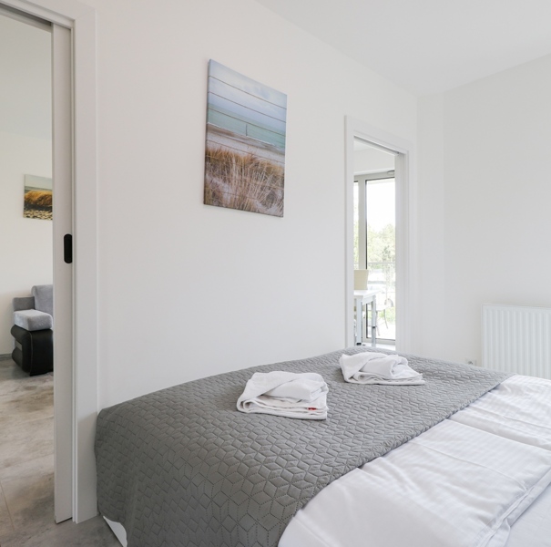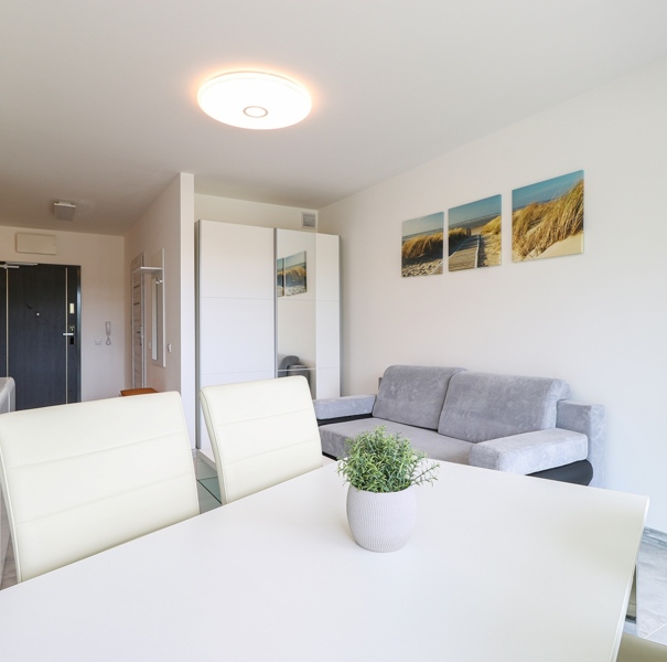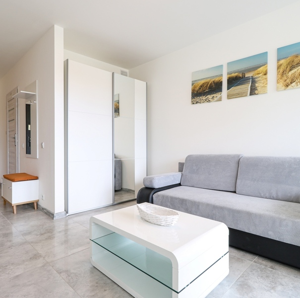 Apartament mieści się na parterze budynku Albus. Lokal składa się z sypialni z wygodnym łóżkiem małżeńskim, salonu z rozkładaną podwójną kanapą, praktyczny stół z krzesłami, w pełni wyposażony aneks kuchenny oraz sporych rozmiarów balkon z meblami tarasowymi. Dodatkowo w apartamencie znajdują się hol ze sporą szafą wnękową oraz łazienka z przestronną kabiną prysznicową. Do dyspozycji Gości są dodatkowo telewizja wraz z bezpłatnym i bezprzewodowym dostępem do Internetu.