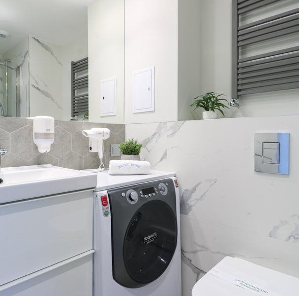 Apartament mieści się na parterze budynku Albus. Lokal składa się z sypialni z wygodnym łóżkiem małżeńskim, salonu z rozkładaną podwójną kanapą, praktyczny stół z krzesłami, w pełni wyposażony aneks kuchenny oraz sporych rozmiarów balkon z meblami tarasowymi. Dodatkowo w apartamencie znajdują się hol ze sporą szafą wnękową oraz łazienka z przestronną kabiną prysznicową. Do dyspozycji Gości są dodatkowo telewizja wraz z bezpłatnym i bezprzewodowym dostępem do Internetu.