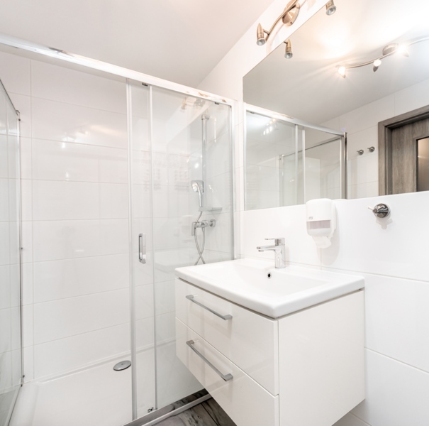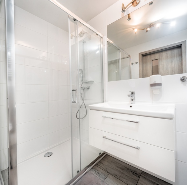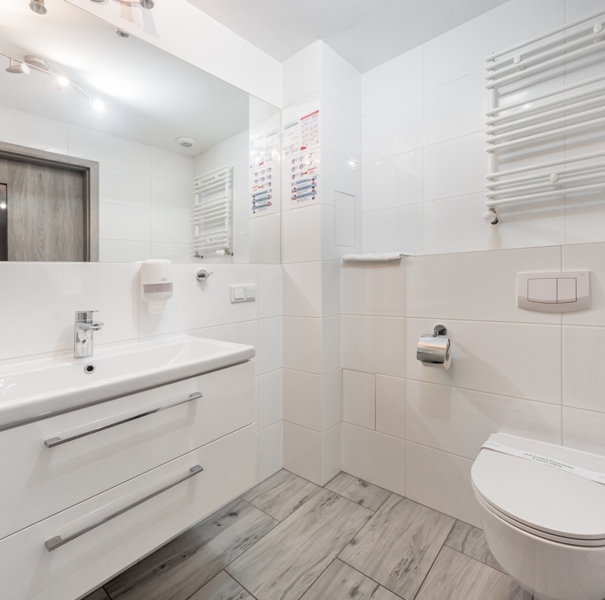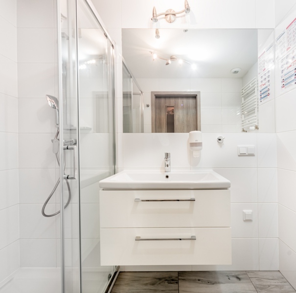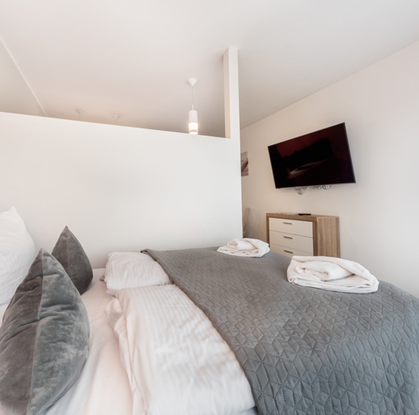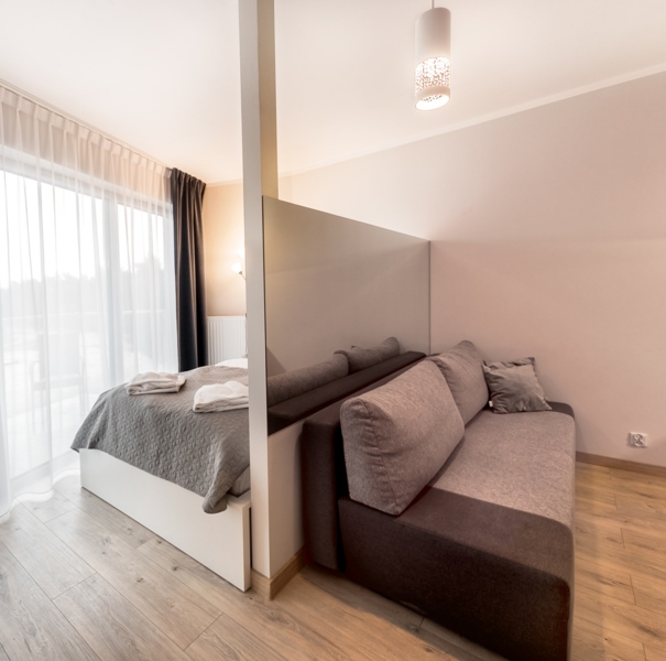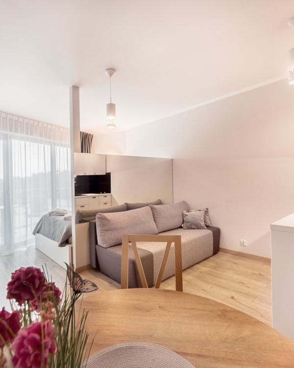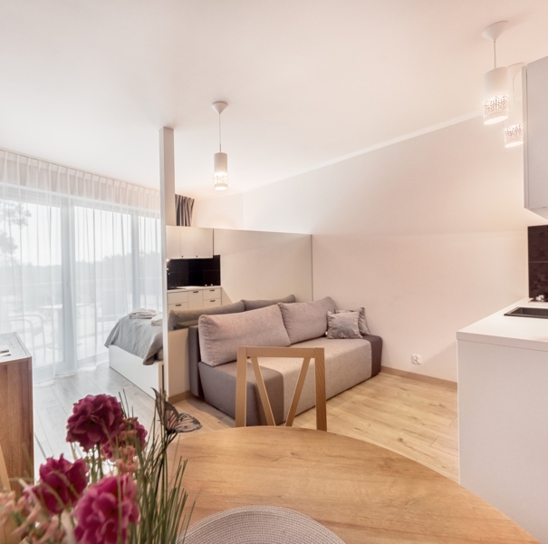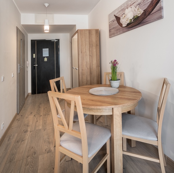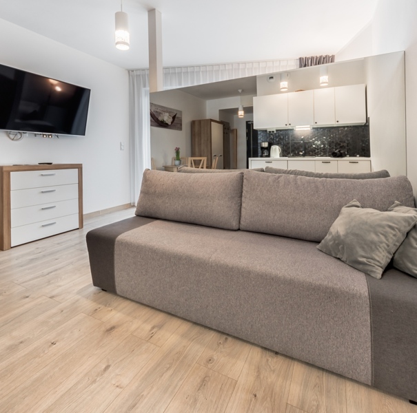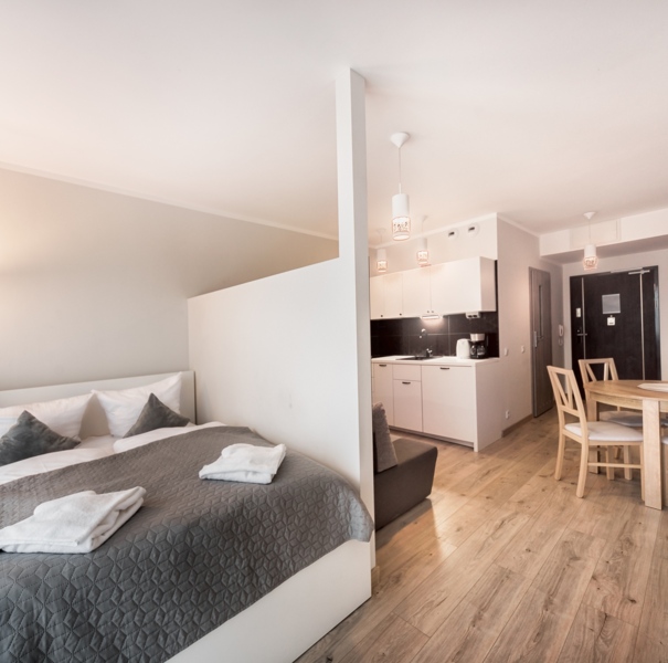 Apartament mieści się na trzecim piętrze budynku Albus. W lokalu znajduje się hol ze sporą szafą wnękową, łazienka z przestronną kabiną prysznicową, wygodne łóżko małżeńskie, mniejsza rozkładana pojedyncza sofa, praktyczny stół z krzesłami, w pełni wyposażony aneks kuchenny oraz sporych rozmiarów balkon z meblami tarasowymi. Do dyspozycji Gości są dodatkowo telewizja wraz z bezpłatnym i bezprzewodowym dostępem do Internetu.
