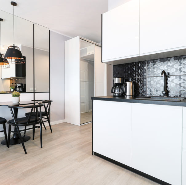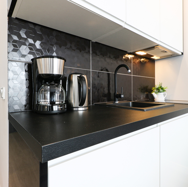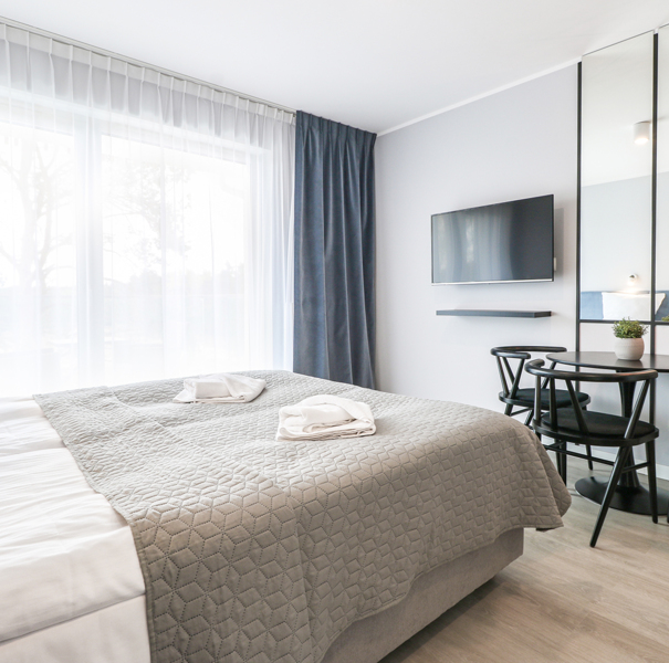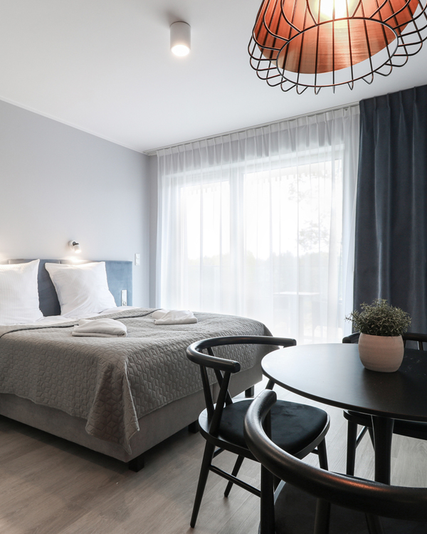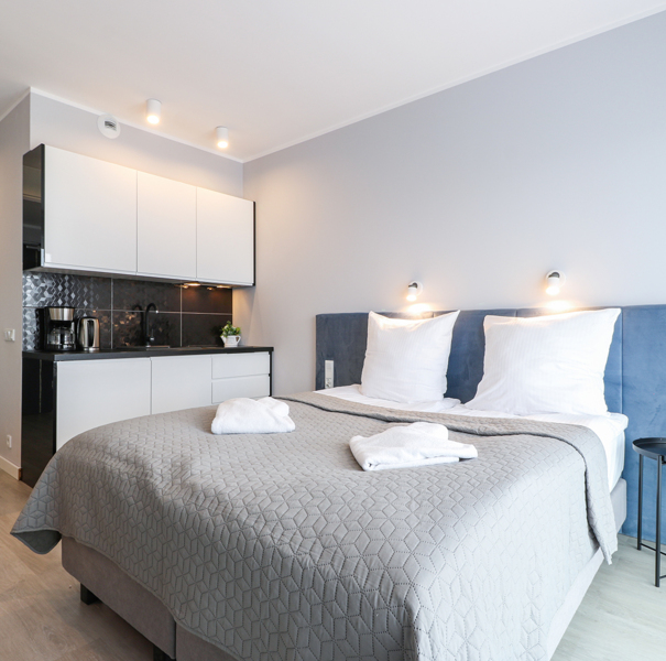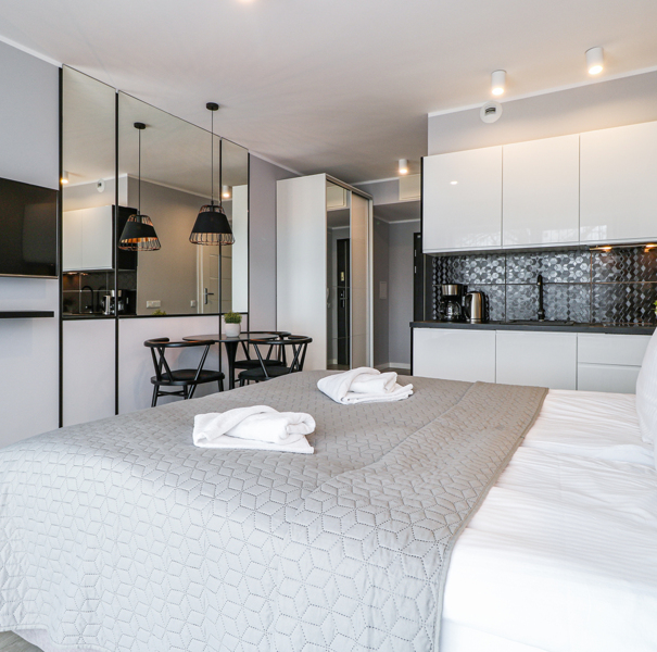 Apartament mieści się na trzecim piętrze budynku Albus. W lokalu znajduje się hol ze sporą szafą wnękową, łazienka z przestronną kabiną prysznicową, wygodne łóżko małżeńskie, praktyczny stół z krzesłami, w pełni wyposażony aneks kuchenny oraz sporych rozmiarów balkon z meblami tarasowymi. Do dyspozycji Gości są dodatkowo telewizja wraz z bezpłatnym i bezprzewodowym dostępem do Internetu.