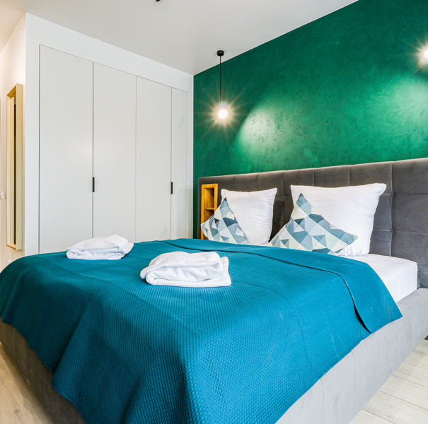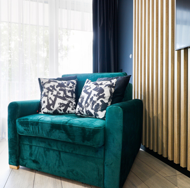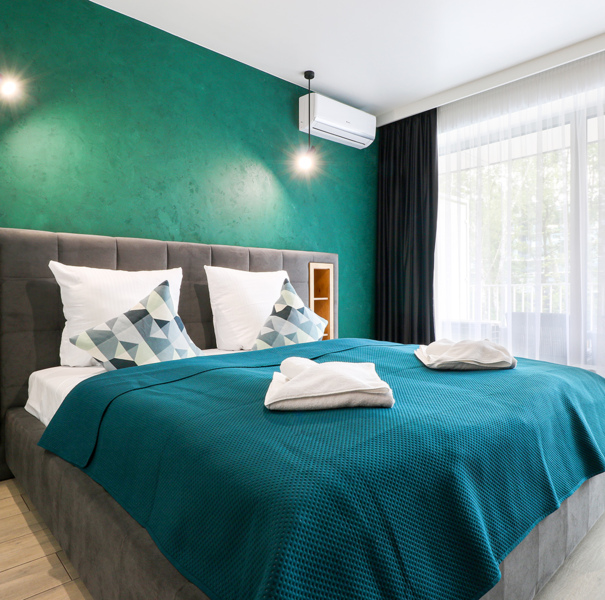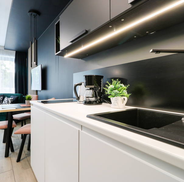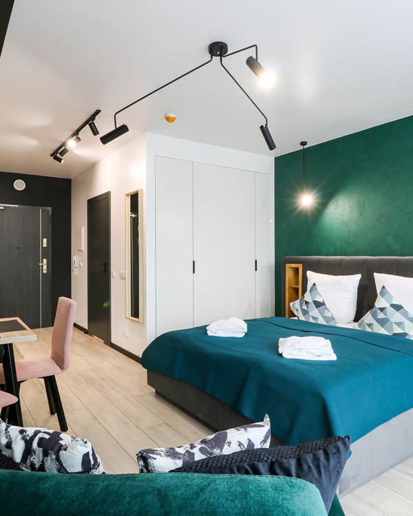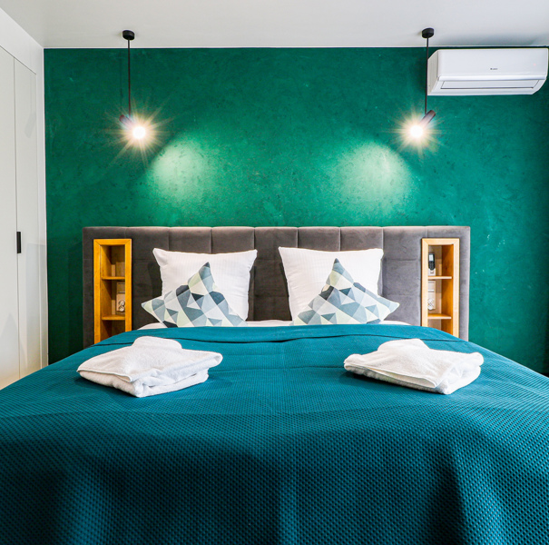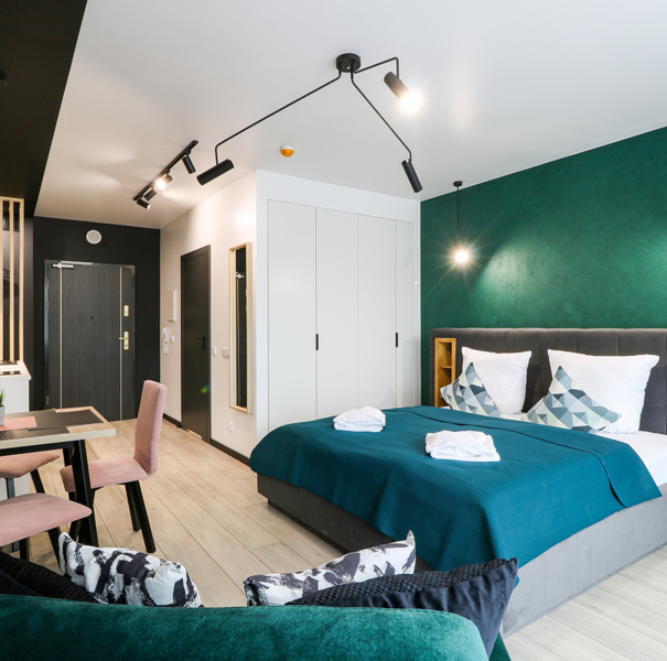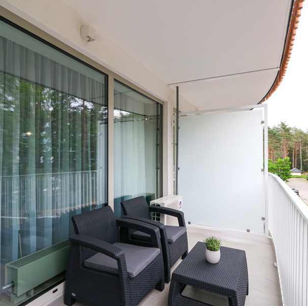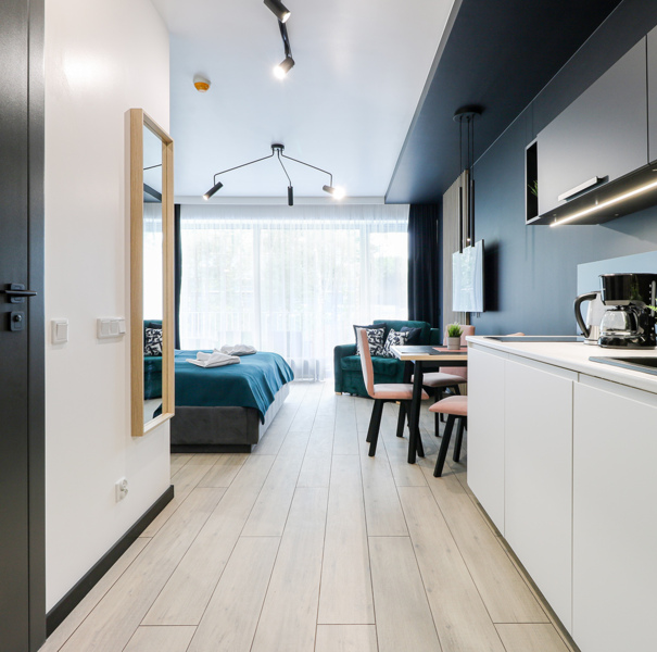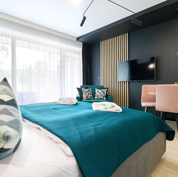 Apartament mieści się na pierwszym piętrze budynku Lividus. W lokalu znajduje się hol ze sporą szafą wnękową, łazienka z przestronną kabiną prysznicową, wygodne łóżko małżeńskie, mniejsza rozkładana pojedyncza sofa, praktyczny stół z krzesłami, w pełni wyposażony aneks kuchenny, klimatyzacja oraz balkon z meblami tarasowymi. Do dyspozycji Gości są dodatkowo telewizja wraz z bezpłatnym i bezprzewodowym dostępem do Internetu.