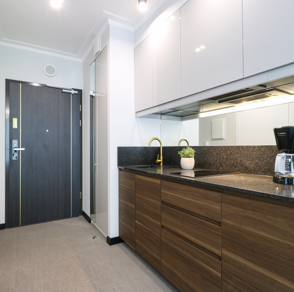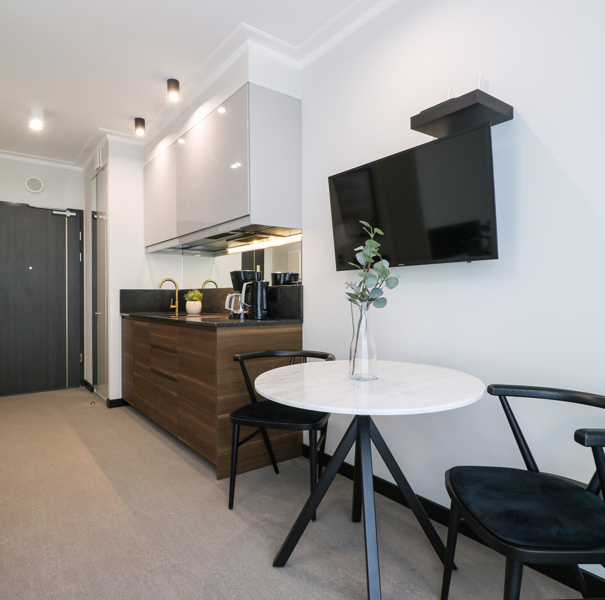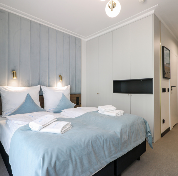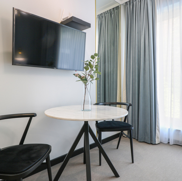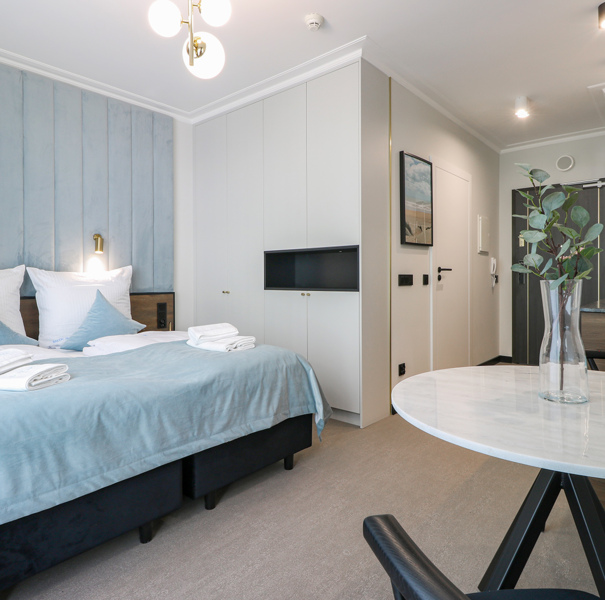 Apartament mieści się na drugim piętrze budynku Lividus, ulokowany jest w wewnętrznej stronie budynku. Ma widok na dziedziniec i posiada balkon francuski. W apartamencie znajduje się hol, łazienka z przestronną kabiną prysznicową, pojedyncza kanapa, wygodne łóżko małżeńskie, praktyczny stół z krzesłami, w pełni wyposażony aneks kuchenny oraz klimatyzacja. Do dyspozycji Gości są dodatkowo telewizja wraz z bezpłatnym i bezprzewodowym dostępem do Internetu.