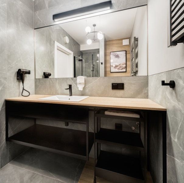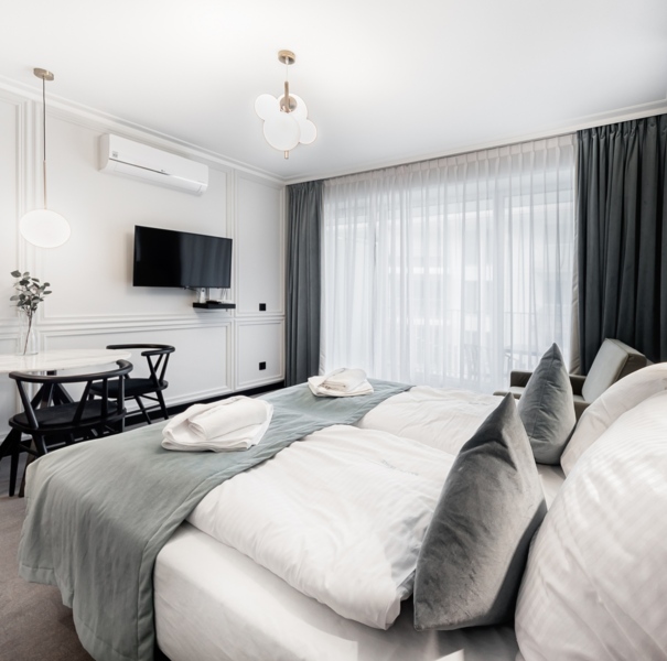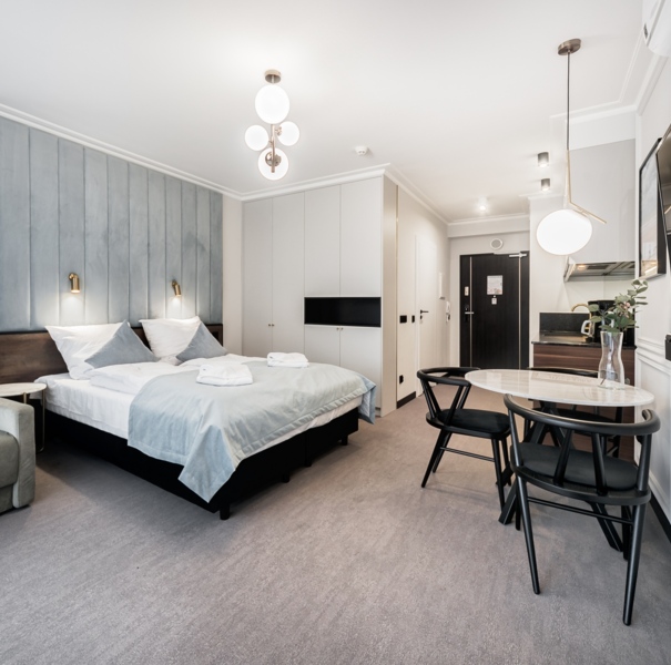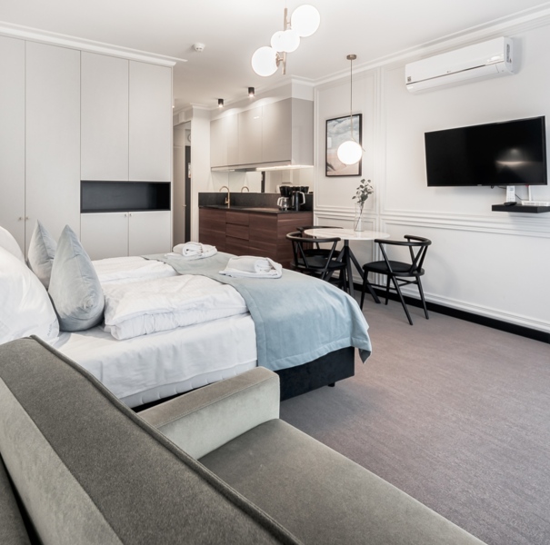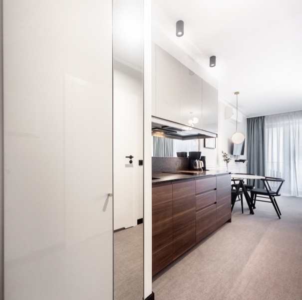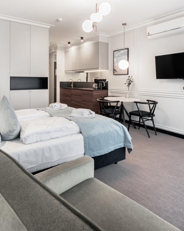 Apartament mieści się na drugim piętrze budynku Lividus. W lokalu znajduje się hol ze sporą szafą wnękową, łazienka z przestronną kabiną prysznicową, wygodne łóżko małżeńskie, mniejsza rozkładana pojedyncza sofa, praktyczny stół z krzesłami, w pełni wyposażony aneks kuchenny, klimatyzacja oraz balkon z meblami tarasowymi. Do dyspozycji Gości są dodatkowo telewizja wraz z bezpłatnym i bezprzewodowym dostępem do Internetu.