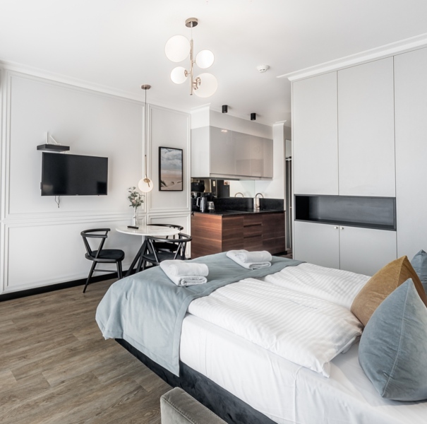 Apartament mieści się na trzecim piętrze budynku Lividus. W lokalu znajduje się hol ze sporą szafą wnękową, łazienka z przestronną kabiną prysznicową, wygodne łóżko małżeńskie, mniejsza rozkładana pojedyncza sofa, praktyczny stół z krzesłami, w pełni wyposażony aneks kuchenny, klimatyzacja oraz balkon z meblami tarasowymi. Do dyspozycji Gości są dodatkowo telewizja wraz z bezpłatnym i bezprzewodowym dostępem do Internetu.