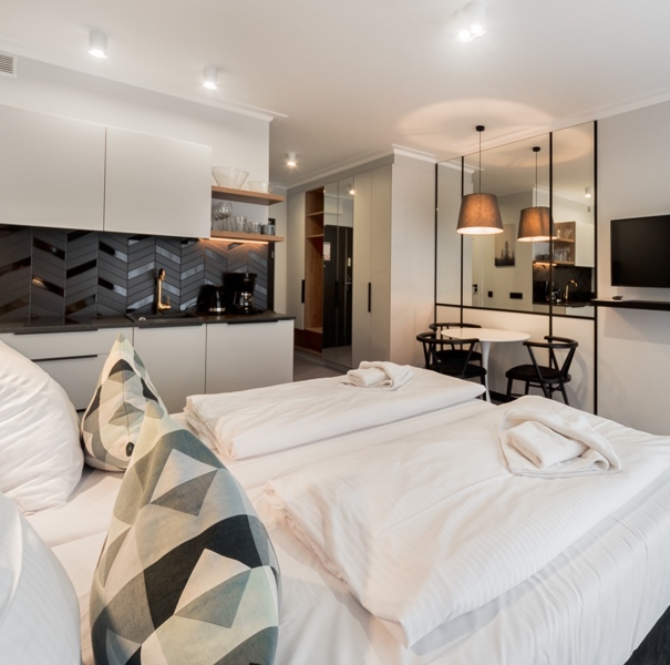Apartament mieści się na parterze budynku Rubus. W lokalu znajduje się hol ze sporą szafą wnękową, łazienka z przestronną kabiną prysznicową, wygodne łóżko małżeńskie, praktyczny stół z krzesłami, w pełni wyposażony aneks kuchenny oraz sporych rozmiarów balkon z meblami tarasowymi. Do dyspozycji Gości są dodatkowo telewizja wraz z bezpłatnym i bezprzewodowym dostępem do Internetu.