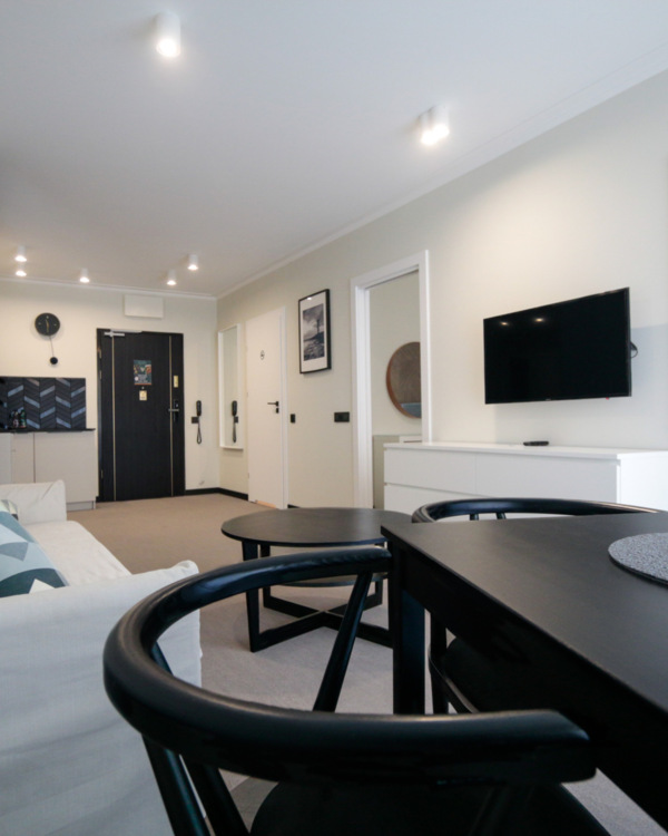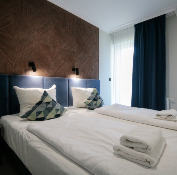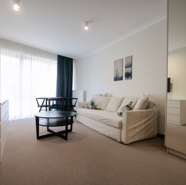 Apartament mieści się na pierwszym piętrze budynku Rubus. Lokal składa się z sypialni z wygodnym łóżkiem małżeńskim, salonu z rozkładaną podwójną kanapą, praktyczny stół z krzesłami, w pełni wyposażony aneks kuchenny oraz sporych rozmiarów balkon z meblami tarasowymi. Dodatkowo w apartamencie znajdują się hol ze sporą szafą wnękową oraz łazienka z przestronną kabiną prysznicową. Do dyspozycji Gości są dodatkowo telewizja wraz z bezpłatnym i bezprzewodowym dostępem do Internetu.