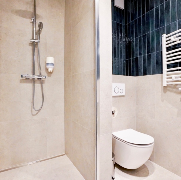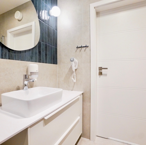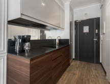 The apartment is located on the second floor of the Lividus building. The unit features a hallway with a sizable closet, a bathroom with a spacious shower stall, a comfortable double bed, a smaller single sofa bed, a practical table and chairs, a fully equipped kitchenette, air conditioning, and a balcony with patio furniture. The guests can also take advantage of the TV and free Wi-Fi.