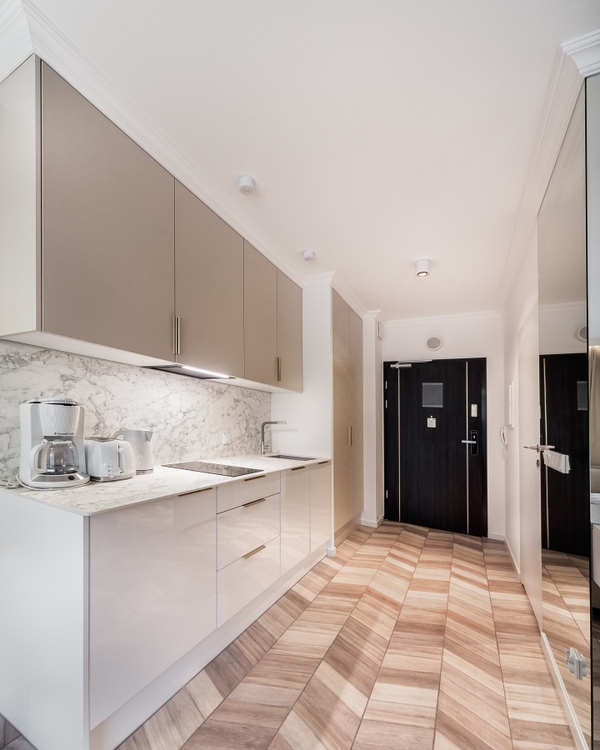 Das Apartment befindet sich im zweiten Stock des Gebäudes Lividus. Es verfügt über einen Flur mit einem geräumigen Einbauschrank, ein Badezimmer mit einer großzügigen Duschkabine, ein komfortables Doppelbett, ein kleineres ausziehbares Einzelsofa, einen praktischen Tisch mit Stühlen, eine voll ausgestattete Küchenzeile sowie einen großzügigen Balkon mit Terrassenmöbeln. Den Gästen stehen zudem ein Fernseher sowie kostenloser WLAN-Internetzugang zur Verfügung.