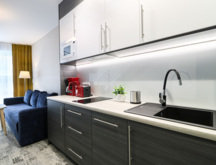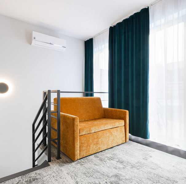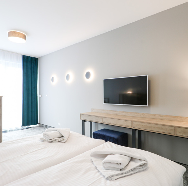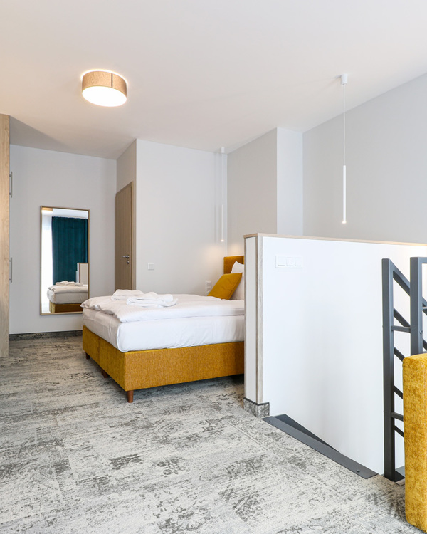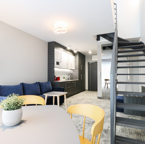 The apartment is located on the fourth floor of the Albus building and has a partial view of the sea. The main floor features a hallway with a closet, a living room with a double sofa bed, a practical table with chairs, a fully equipped kitchenette with a dishwasher, a bathroom with a spacious shower stall and a washing machine, and a sizable balcony with patio furniture. The second floor of the apartment consists of a double bedroom with a comfortable bed and a sofa bed for a child up to the age of 12, as well as a separate toilet. The apartment also has air conditioning. The guests can also take advantage of the TV and free Wi-Fi.