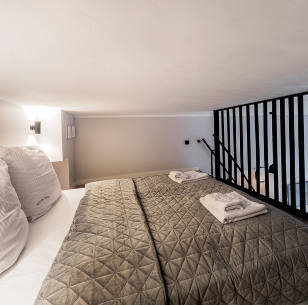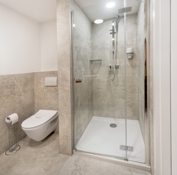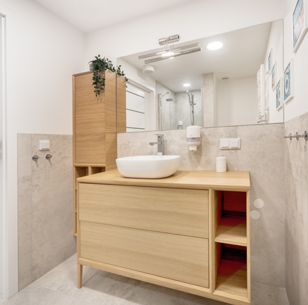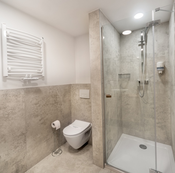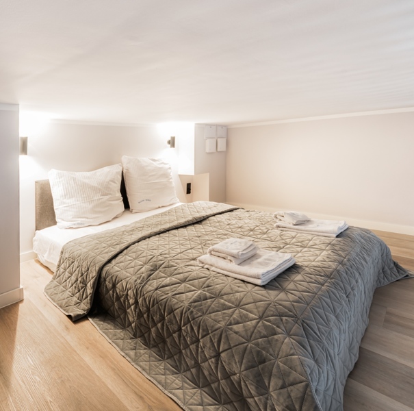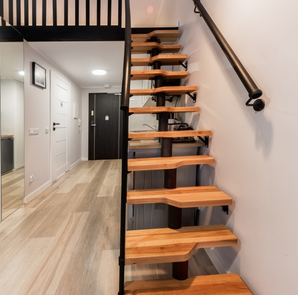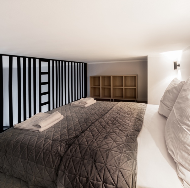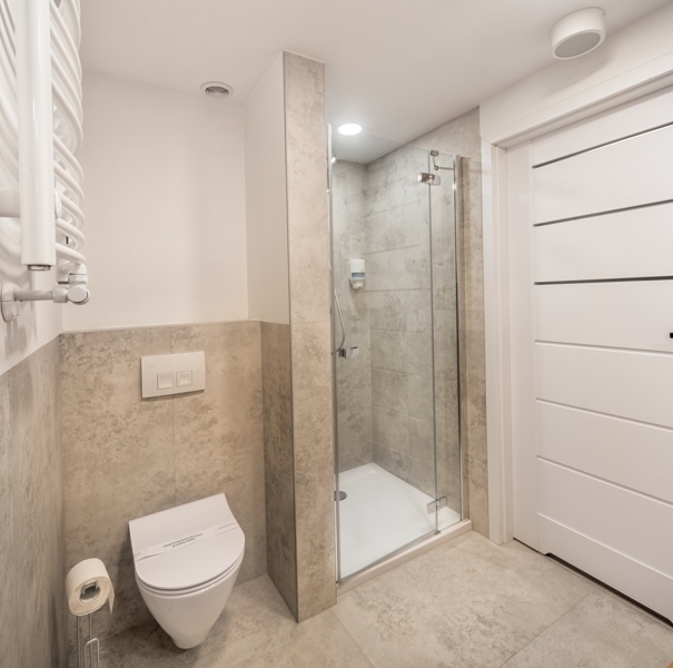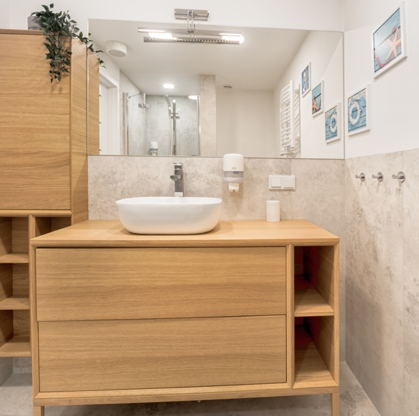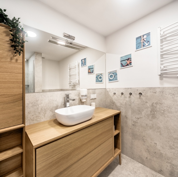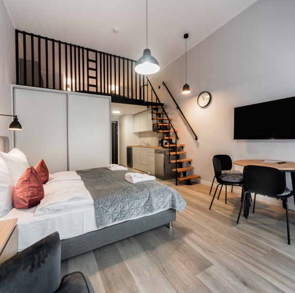 The apartment is located on the ground floor of the Lividus building. The unit features a hallway with a sizable closet, a bathroom with a spacious shower stall, a comfortable double bed, a smaller single sofa bed, a practical table and chairs, a fully equipped kitchenette, and a sizable balcony with patio furniture. The guests can also take advantage of the TV and free Wi-Fi.