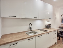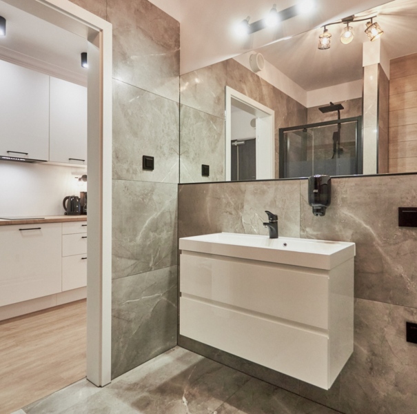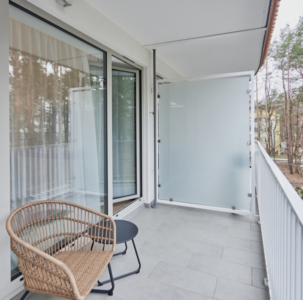 The apartment is located on the first floor of the Lividus building. The unit features a hallway with a sizable closet, a bathroom with a spacious shower stall, a comfortable double bed, a smaller single sofa bed, a practical table and chairs, a fully equipped kitchenette, and a sizable balcony with patio furniture. The guests can also take advantage of the TV and free Wi-Fi.