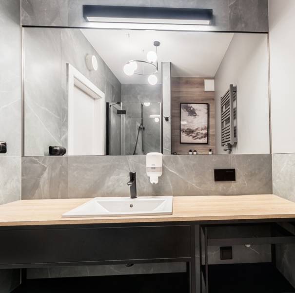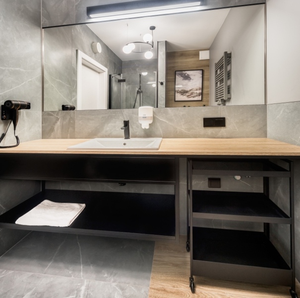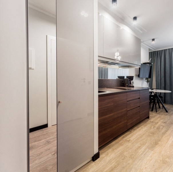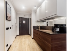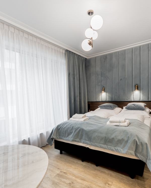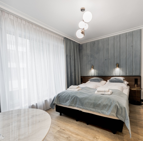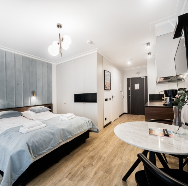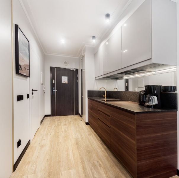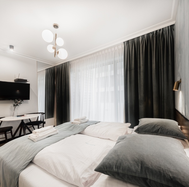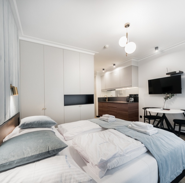 The apartment is located on the first floor of the Lividus building, is located on the inner side of the building. It overlooks the courtyard and has a French balcony. The apartment has a hall, a bathroom with a spacious shower, a single sofa bed, a comfortable double bed, a practical table with chairs, and a fully equipped kitchenette. The guests can also take advantage of the TV and free Wi-Fi.