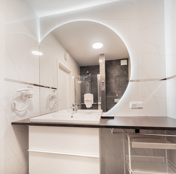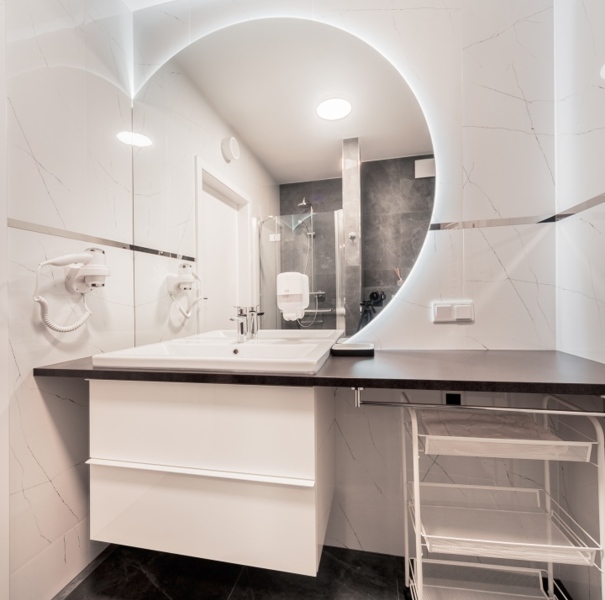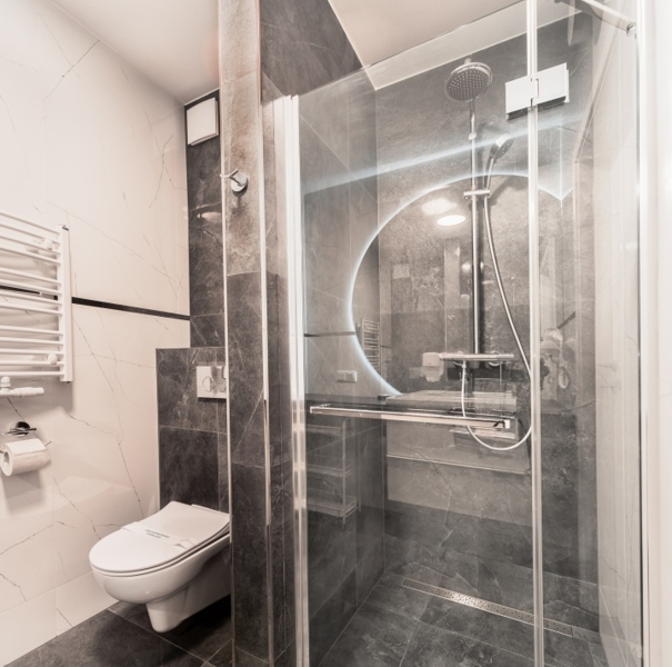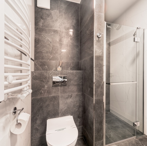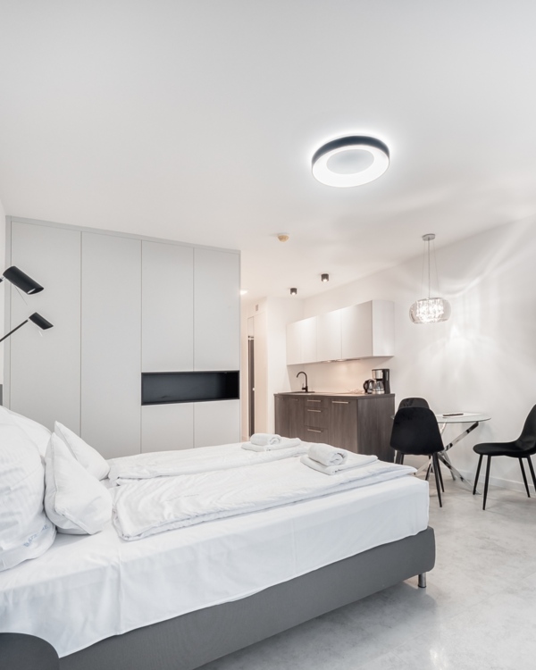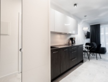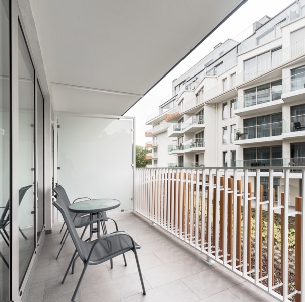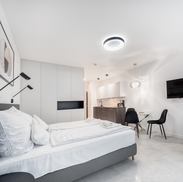 The apartment is located on the first floor of the Lividus building. The unit features a hallway with a sizable closet, a bathroom with a spacious shower stall, a comfortable double bed, a smaller single sofa bed, a practical table and chairs, a fully equipped kitchenette, and a sizable balcony with patio furniture. The guests can also take advantage of the TV and free Wi-Fi.