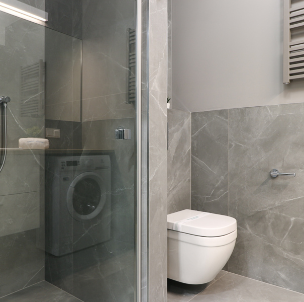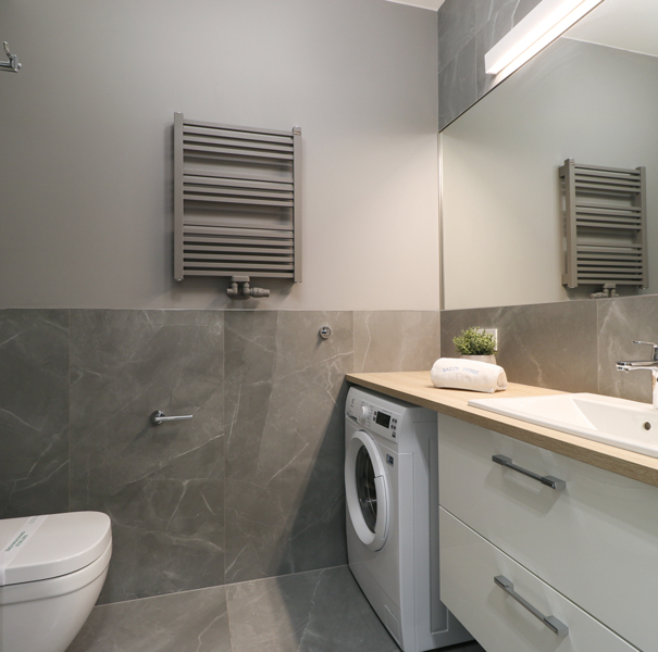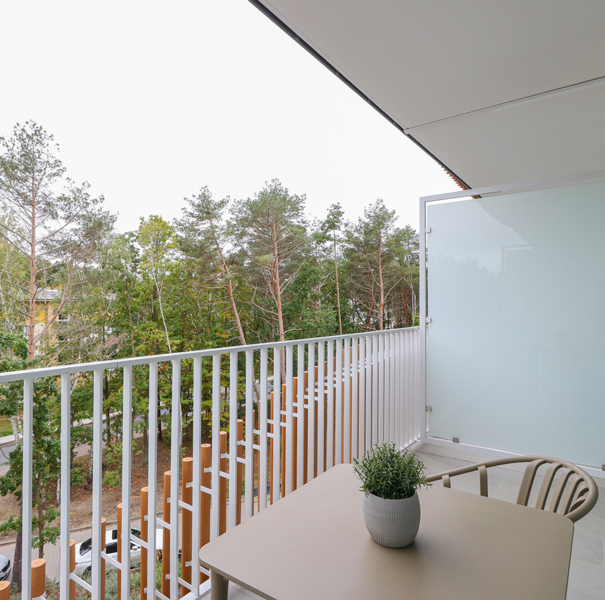 The apartment is located on the third floor of the Lividus building. The unit features a hallway with a sizable closet, a bathroom with a spacious shower stall, a comfortable double bed, a practical table and chairs, a fully equipped kitchenette, and a balcony with patio furniture. The guests can also take advantage of the TV and free Wi-Fi.