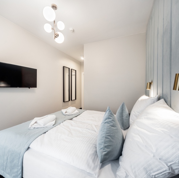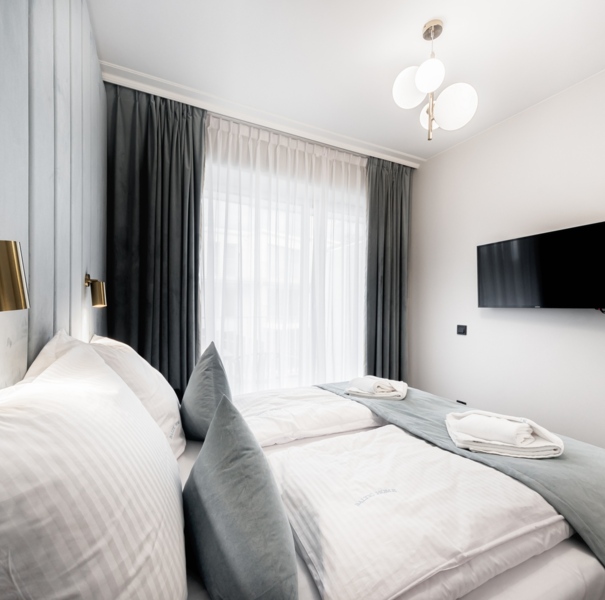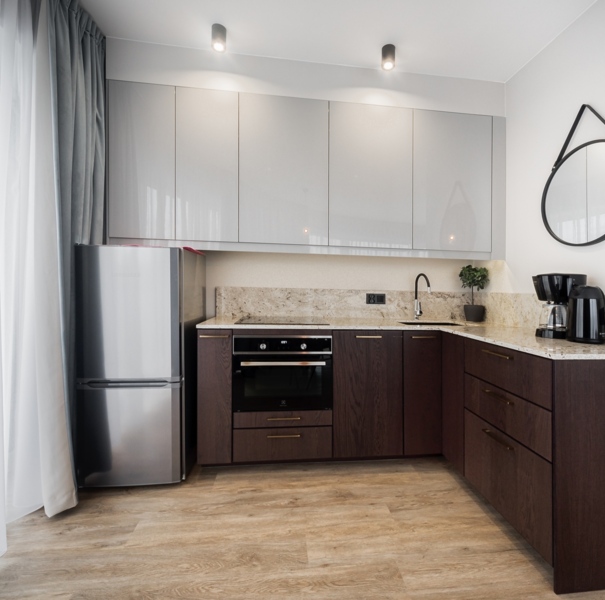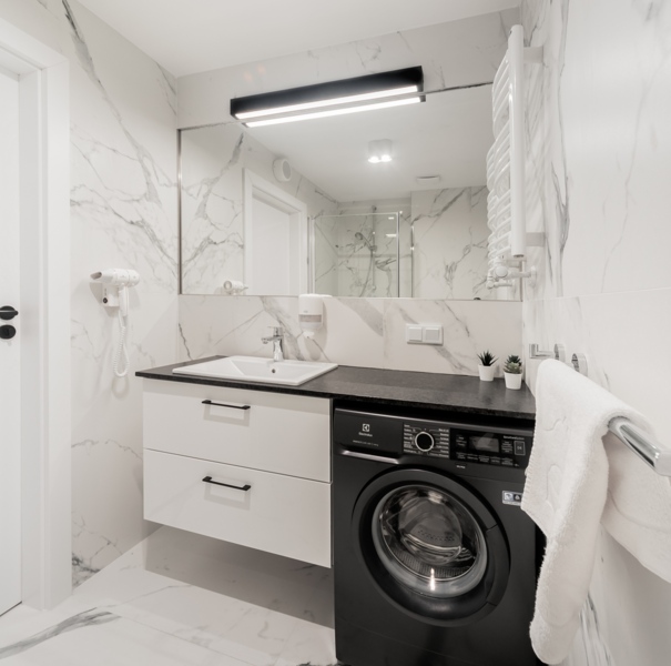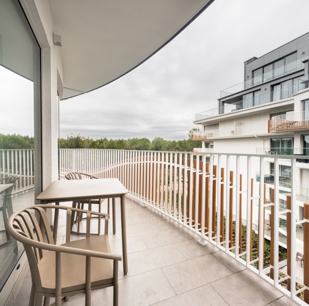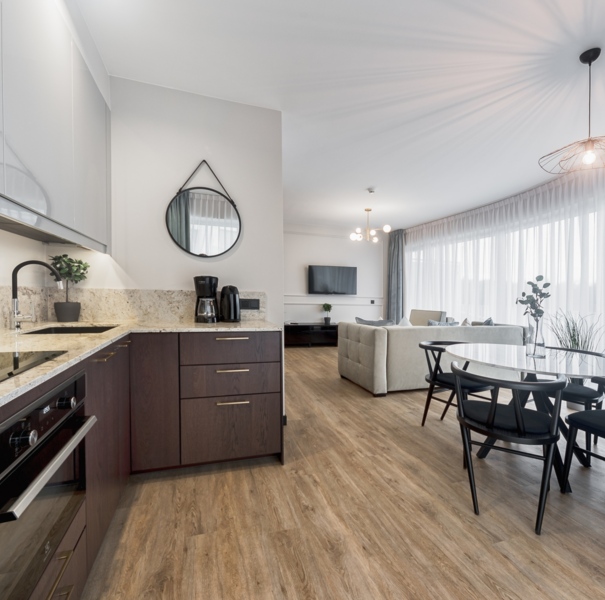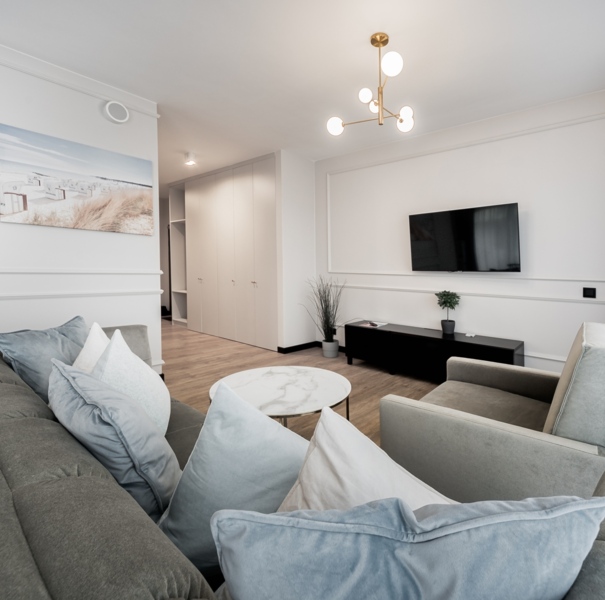 The apartment is located on the third floor of the Lividus building. The unit consists of a bedroom with a comfortable double bed and a living room with two sofa beds: one double and one single. The apartment has a practical table and chairs, a fully equipped kitchenette with dishwasher and oven, and a sizable balcony with patio furniture. Additionally, the apartment has a hallway with a sizable closet and a bathroom with a spacious shower stall. The guests can also take advantage of the TV and free Wi-Fi.