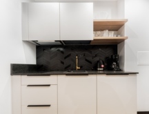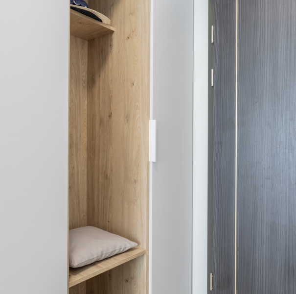 The apartment is located on the first floor of the Rubus building. The unit features a hallway with a sizable closet, a bathroom with a spacious shower stall, a comfortable double bed, a practical table and chairs, a fully equipped kitchenette, and a sizable balcony with patio furniture. The guests can also take advantage of the TV and free Wi-Fi.