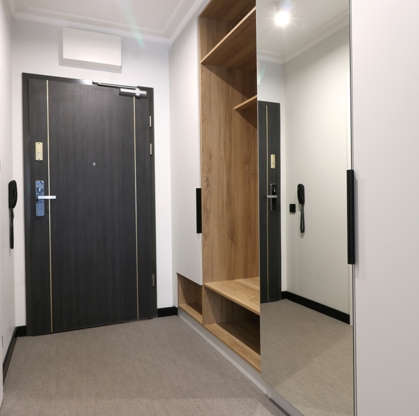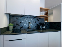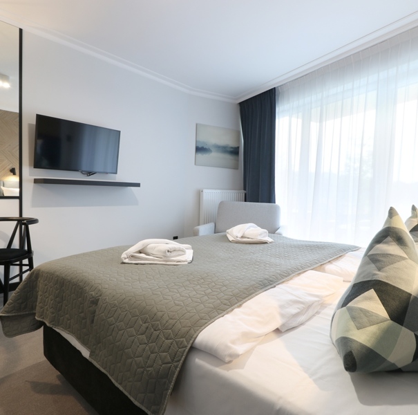 The apartment is located on the first floor of the Rubus building. The unit features a hallway with a sizable closet, a bathroom with a spacious shower stall, a comfortable double bed, a smaller single sofa bed, a practical table and chairs, a fully equipped kitchenette, and a sizable balcony with patio furniture. The guests can also take advantage of the TV and free Wi-Fi.