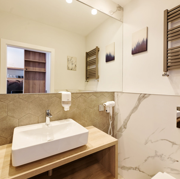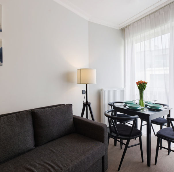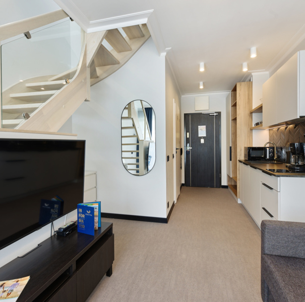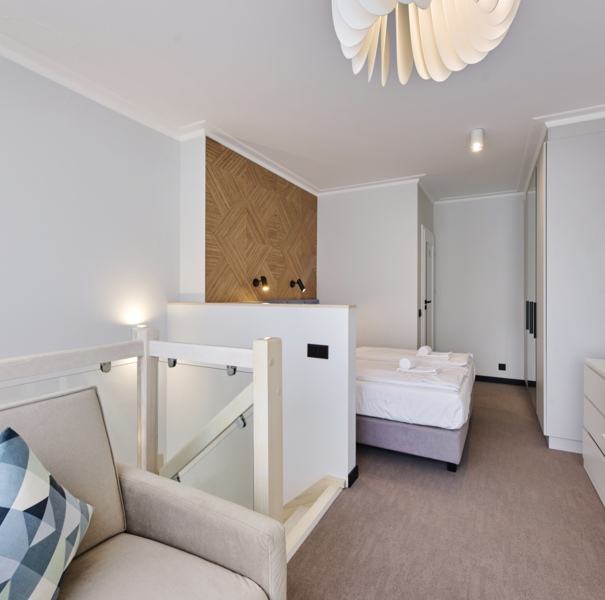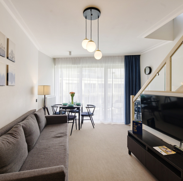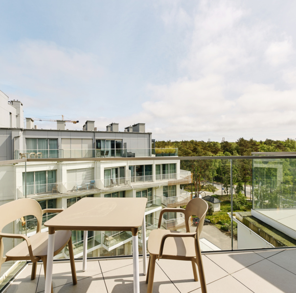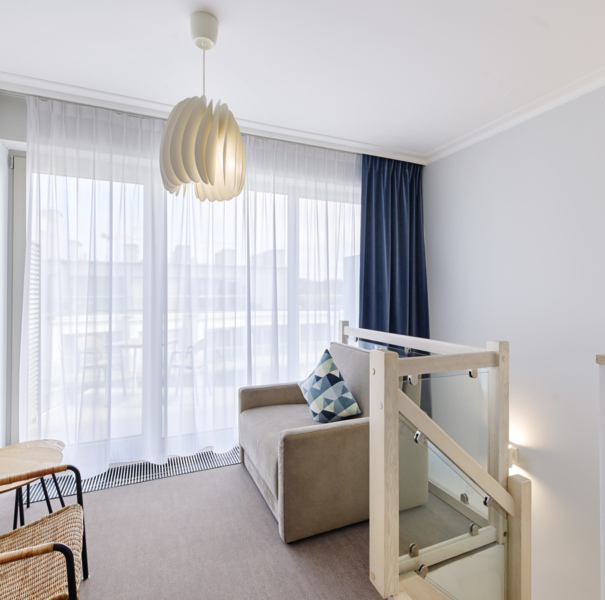 The apartment is located on the fourth floor of the Rubus building. The main floor of the unit consists of a hallway with a closet, a living room with a sofa bed, a practical table with chairs, a fully equipped kitchenette, a bathroom with a spacious shower stall, and a sizable balcony with patio furniture. On the second level of the apartment there is a double bedroom with a comfortable bed, a bathroom, and a balcony. The guests can also take advantage of the TV and free Wi-Fi.