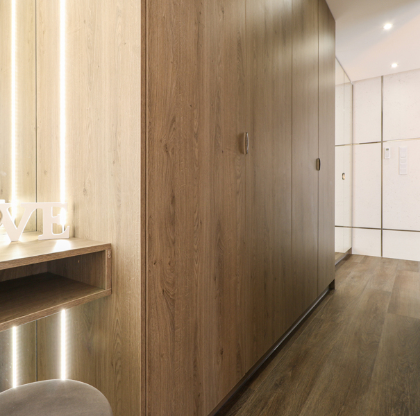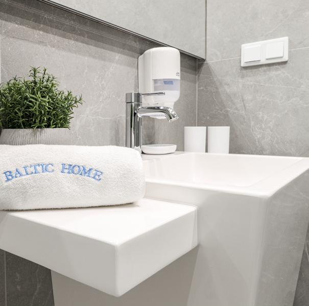 The apartment is located on the fourth floor of the Rubus building and faces northwest. On the main floor there is a living room with a double sofa bed, a table with chairs, a fully equipped kitchenette with a dishwasher, a bathroom with a spacious shower stall, and a sizable balcony with patio furniture. The second level of the apartment consists of a double bedroom with a comfortable bed and a dressing room, a bathroom with a spacious shower, and a huge terrace with a direct view of the sea. Additionally, the apartment has a hallway with a large closet and air conditioning. The guests can also take advantage of the TV and free Wi-Fi.