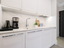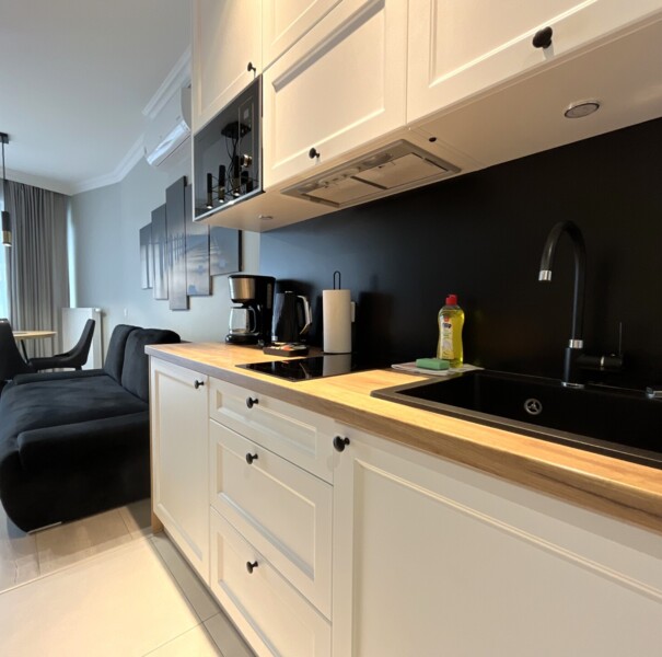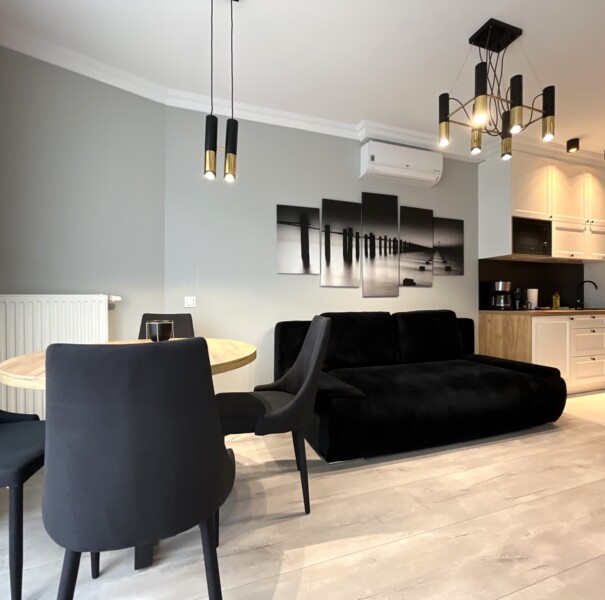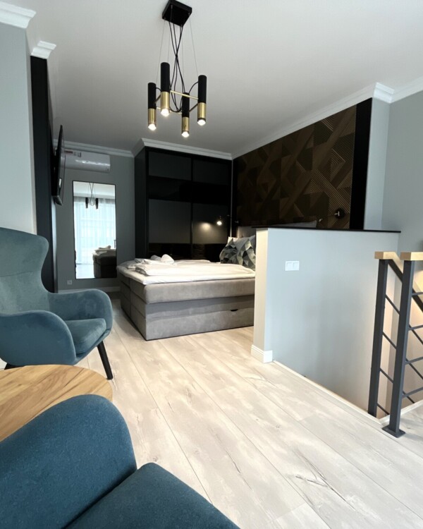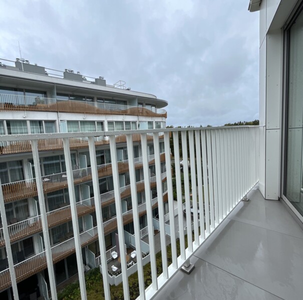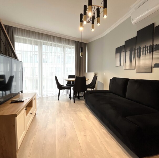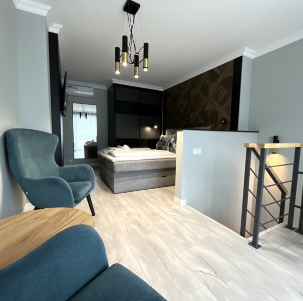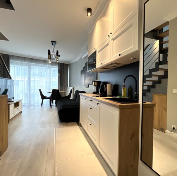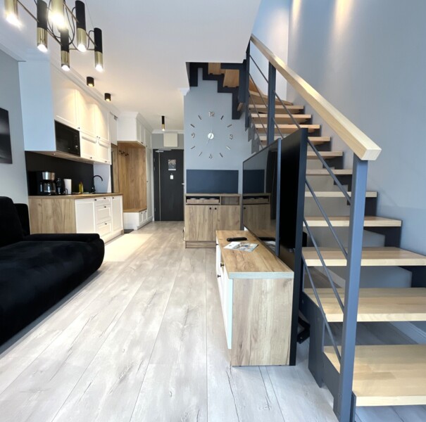 The apartment is located on the fourth floor of the Rubus building. The main floor of the unit consists of a hallway with a closet, a living room with a sofa bed, a practical table with chairs, a fully equipped kitchenette, a bathroom with a spacious shower stall, and a sizable balcony with patio furniture. On the second level of the apartment there is a double bedroom with a comfortable bed, a bathroom, and a balcony. The guests can also take advantage of the TV and free Wi-Fi.
